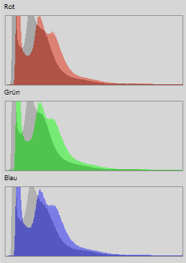For each of the above scan's elements we created a known linear reference scan to compare the FlexColor result to. I took two more or less identical crops — one from the linear scan and one from the FlexColor scan (which had the NoScannerGamma trick applied). I expanded the color channels of either by using a single multiplier per channel. Then I took screenshots of the resulting histograms. I converted the linear scan's histogram to grayscale, copied the FlexColor one on top, and set it to 50% opacity. So there are two histograms overlaid in each graph below: one from a known linear scan (gray in the background) and the FlexColor one in RGB.