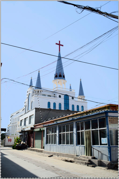 点击教堂白色墙壁后画面偏色正常 The final result after adjustments in Camera Raw.