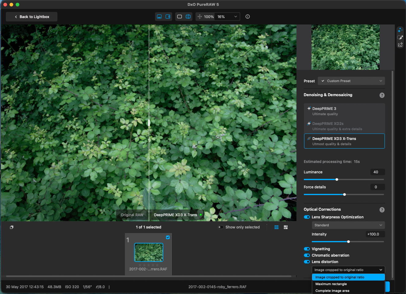 I initially thought the Luminance slider might have something to do with image brightness — something like fill light or a general tonal shift — because I did observe brightness differences in my first tests. That, however, turned out to be caused by vignetting removal from the optical corrections, not by the slider itself.