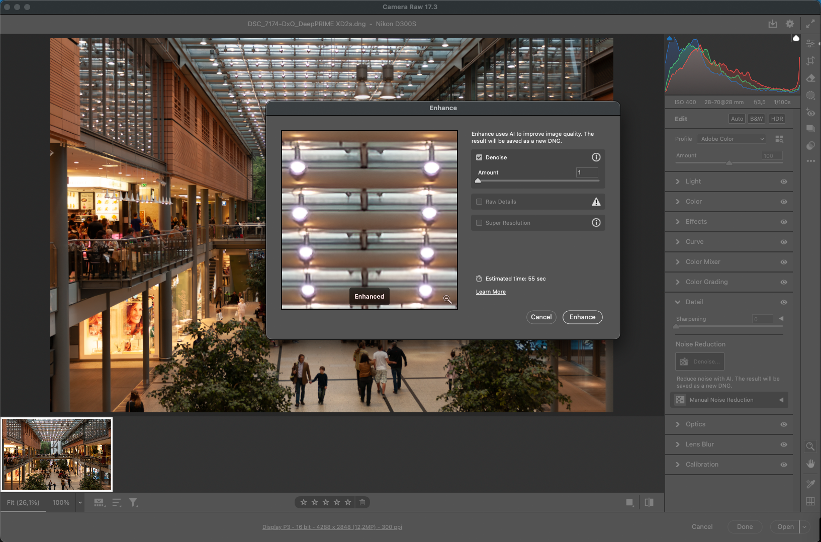 If we try to use Enhance Denoise directly on the NEF, ACR fails miserably.