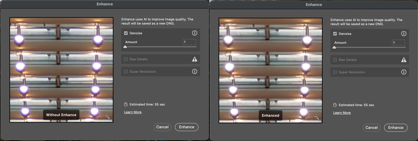 Yes, in our workflow the key step used to be: open the native raw in ACR or Lightroom, invoke the Enhance command (for Denoise, Raw Details or Super Resolution) and obtain a separate ‘Enhanced’ DNG file — a demosaiced, processed-but-raw intermediate that could then be handed off to ColourPerfect/PerfectRaw. With the April 2025/June 2025 releases (ACR 17.4 / LrC 14.4) Adobe changed the pipeline: the enhancement is now done in-place (non-destructive) inside the Develop/Detail panel and does not produce a standalone DNG that you can export for downstream raw-level processing. In short, the export-DNG path is removed. For users who require that exact intermediate the only reliable option is to retain ACR 17.3 or earlier, and LrC 14.3 or earlier.
