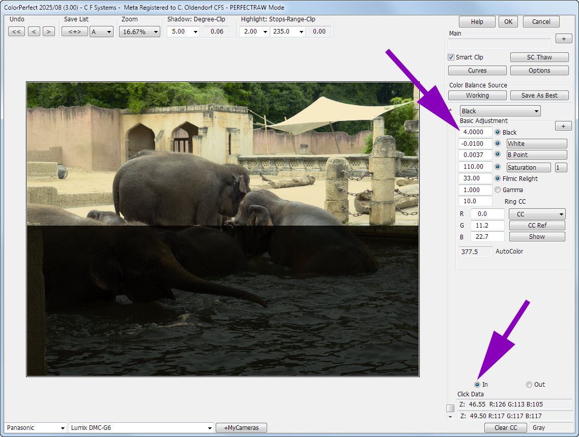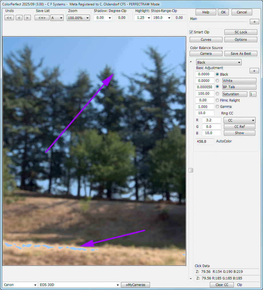 Now, after generating a Linear .Tiff using MakeTiff, with the embedded AdobeRGB Profile, and conversion, I face the issue specially on the blown out "angel wings". If I dont have Smart Clip activated, I have Magenta Tint on the Highlight. In order to avoid the magenta tint, I have to increase the "Black" until it is pure white, this however leads to a loss of detail in a lot of the highlights. If I decrease the Highlight to recover the detail, I get more and more magenta.
