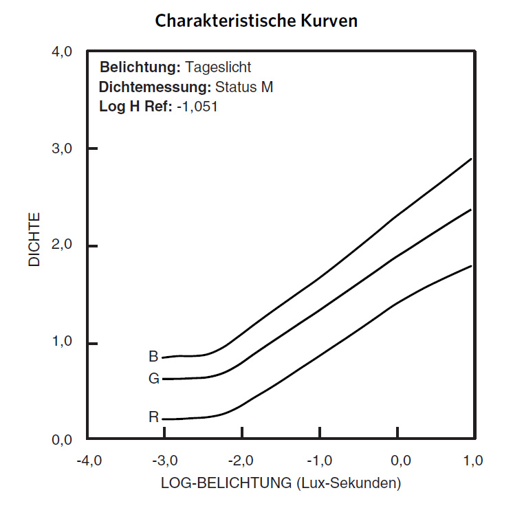 Kodak typically does not plot the shoulder behaviour of the film, but in the data we do have, we see that at 0.0 log exposure red visibly builds up less density than blue and somewhat less than green. The blue line continues straight through. So if we see bluish brighter grays on the step tablet, that can be due to this. 0.3 log exposure is equal to 1 EV, so if you were to let your darkest tones fall at Zone III — that is, spot-meter them and expose the result by –2 EV — you should get recognition of substance and texture in those darkest parts, and about 7 EV afterwards should remain well behaved. If, however, you exposed your darkest image portions to be at, say, Zone VI, then you would have nothing less dense on the negative. You would still get a printable result, but you would be pushing into that shoulder. When I say Zone ... I mean it in the sense Ansel proposed for B&W.
